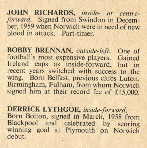 Nobody in these teams is famous nowadays, at least, not outside their own club. The programme contained pen-pictures of the visiting players. These three were selected as being typical of the fifteen or so in the programme. The thought to carry with you is that, for John Richards, Bobby Brennan or Derrick Lythgoe, this could have been the greatest moment of their lives: