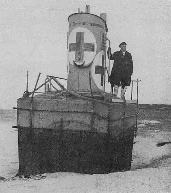 Shot-down airmen from both sides were strongly attracted to these buoys and many a desperate game of Schcrabble or Buckaroo was played to decide who had first dibs with the rescue buoys’ bratwurst or their assortment of smoked cheeses. British airmen and seamen called the Rettungsbojen “Lobster Pots” for their shape: